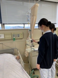 教員が患者と看護師役となり、バイタルサインのチェック、点滴、