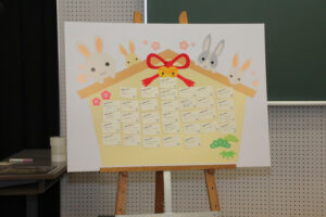 次に、3年生は目標カードに自身の目標を書き、目標達成を祈願して大きな絵馬へそれを貼り付けました。