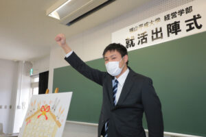 式には経営学科の3年生約30名が参加し、この出陣式で就職活動へ気持ちを切り替えて、希望の会社の内定を獲得するため に動き出しました。