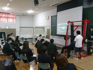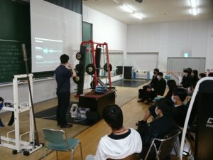 アスレティックトレーナーとして活躍されている峯田講師の模擬授業では、効率の良いトレーニングについて、筋力トレーニングを中心に教えてもらいました。