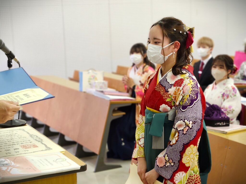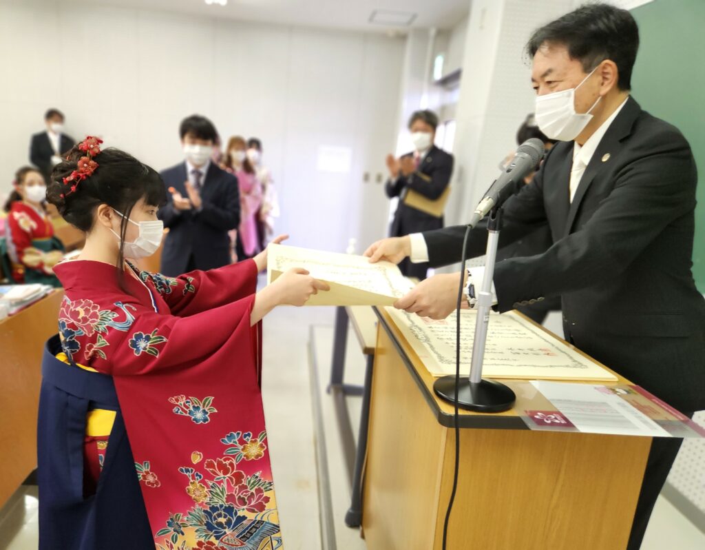全学部学科合同での式典後は、各学科ごとに分かれ、一人一人に学科長の三藤教授より学位記が授与されました。