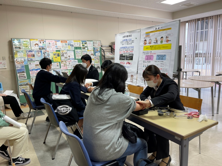 また、看護学部棟1階では、ご来場くださった方の健康チェックとして、血圧測定、血管年齢測定を看護学生が行いました。