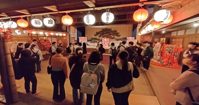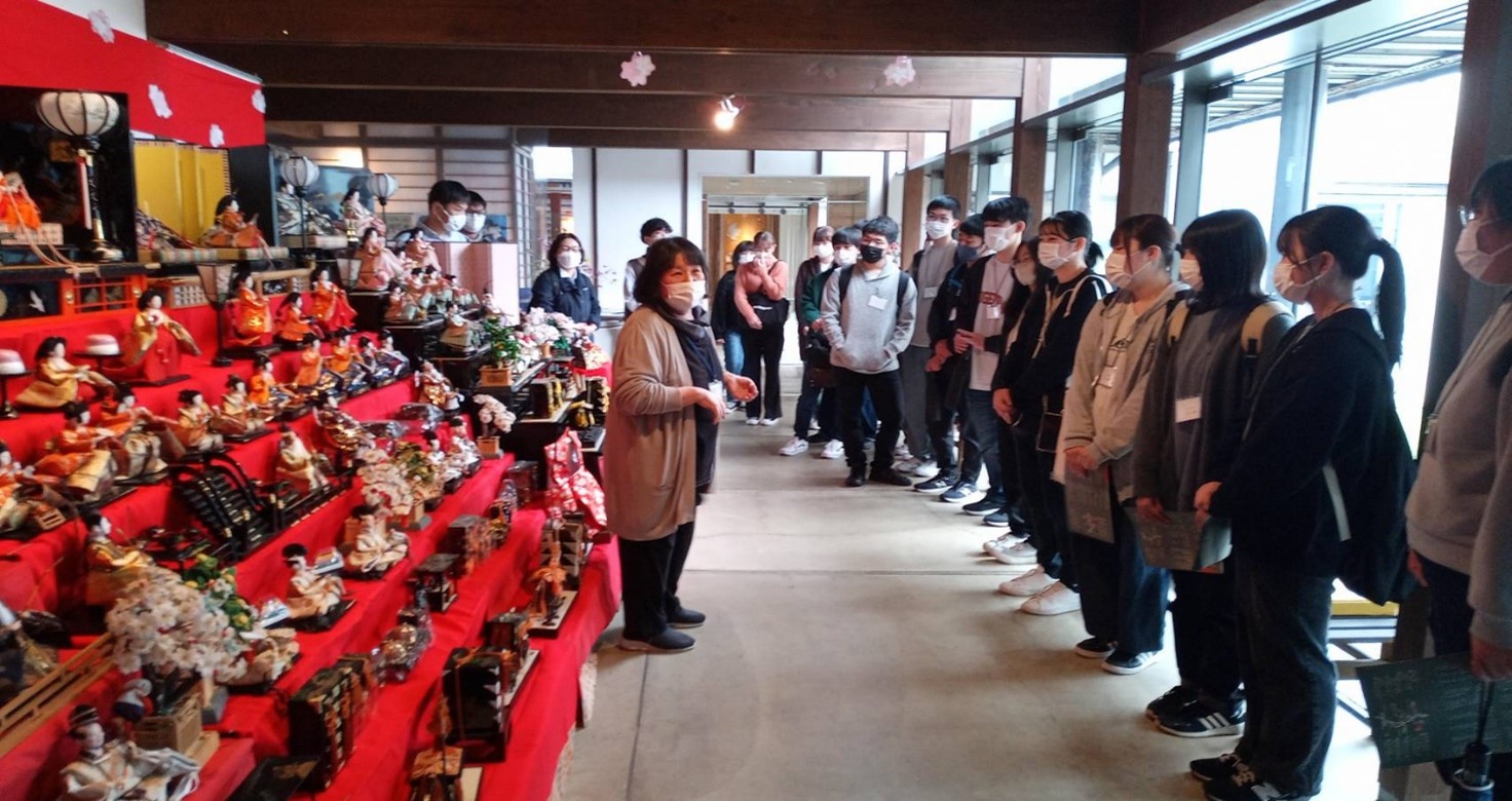 昼食後は、白壁やなまこ壁、格子戸といった大人にはレトロで、学生には逆に新鮮に感じる町並みを散策しました。また、「府中市上下歴史文化資料館」や国登録有形文化財の「翁座」を訪れ、館長や職員さんから説明を受けました。