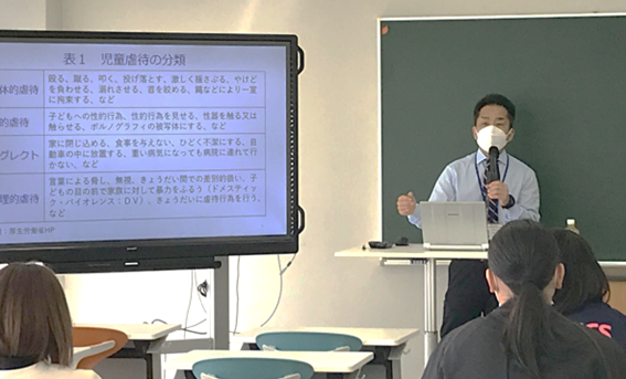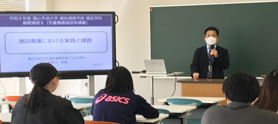 本年度は前期に、「児童養護施設」や「特別支援学校」の見学に行き、現場を体験することを予定しております。そこで、事前学修として、こども学科の矢野川祥典先生に、「施設養護における実践と課題」について、これまでのご経験を踏まえて学ばせて頂きました。先生のご講話で学びを深めました。