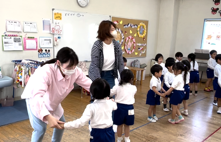 「教育実習ⅠⅡ(幼稚園)事前事後指導」という科目で、8月から始まる幼稚園教育実習・保育実習を前に保育現場で保育に参加して、保育に関する感覚や保育者としての関わり方について学ぶことを目的としています。こども学科では、このように現場の幼稚園・保育園の先生方のお力を借りながら、生きた学びを体験する機会を多く設けています。