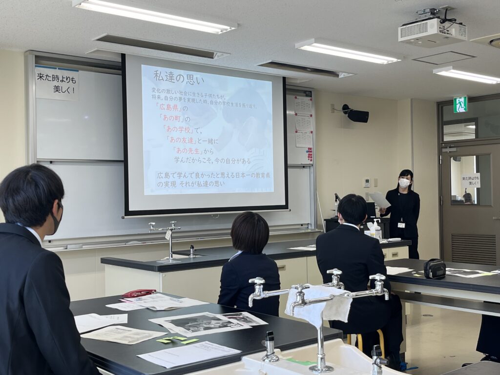 先日、広島県教員委員会より、管理主事の先生が本学の学生のために、「求められる教職員像 ~教師の一日の仕事を通して~」というタイトルのもと出前講座にお越しくださいました。