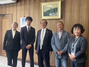 部長の 國原秀海君と岡崎あゆみさん(いずれも健康スポーツ科学科3年)、島田監督(島田國三郎さん)、中村顧問(中村雅子教授)が学長室を訪問し、冨士学長に試合結果を報告しました。部員達は週7日の練習で、試合に臨んだそうです。