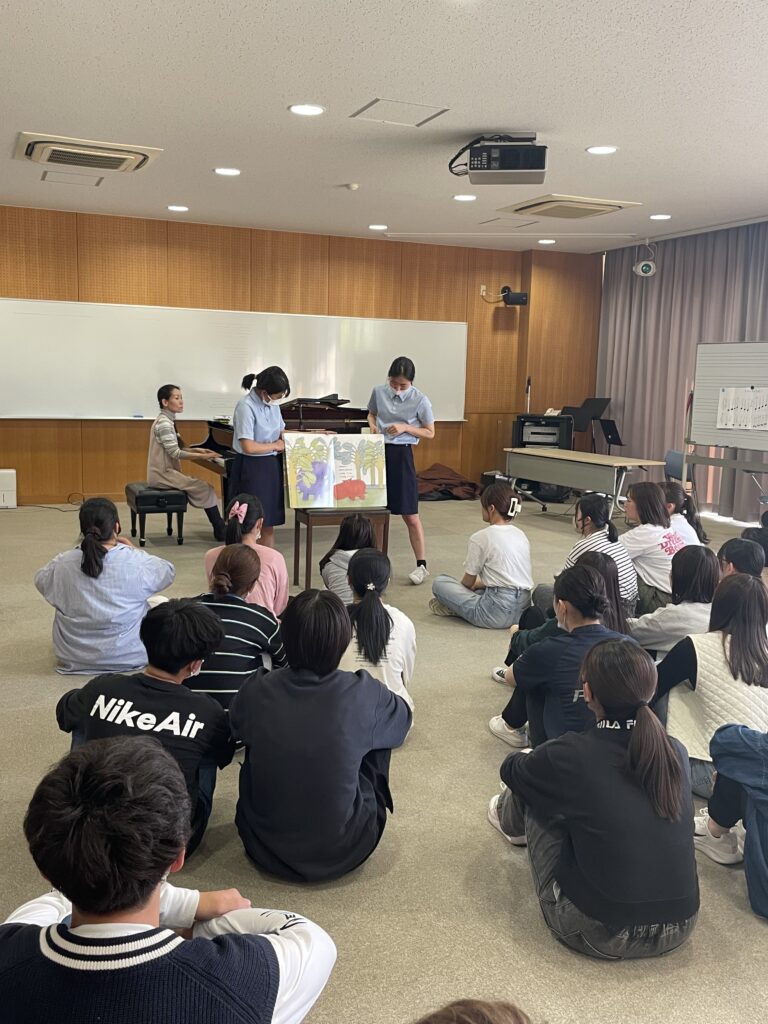 こども学科では、「学校法人崇主学園御調みくに幼稚園」の幼稚園教諭3名をお招きし、「幼稚園の先生と遊ぼう」と題した授業を展開しました。