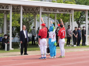 開会式では、冨士学長の挨拶のあと、健康スポーツ科学科の深田雅也さん、田上穂乃香さん、木村朝陽さんの3名が、ユニークな選手宣誓を行い笑顔溢れる開会式になりました。