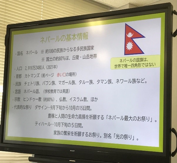 マニタさんから、ネパールは、約100の民族からなる多民族国家であることなどネパールについての基本情報と衣食住を含む文化についても教えて頂きました。マニタさん個人的にはネパールは海がないため、日本に来て海が見られて幸せであったとおっしゃっていました。