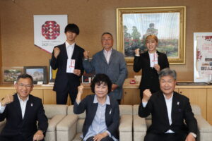 その出場権を得た本学ソフトテニス部の主将 國原秀海君と岡崎あゆみさん(いずれも健康スポーツ科学科3年)と島田監督(島田國三郎さん)、中村顧問(中村雅子教授)は、6月9日 福山市長を表敬訪問しました。
