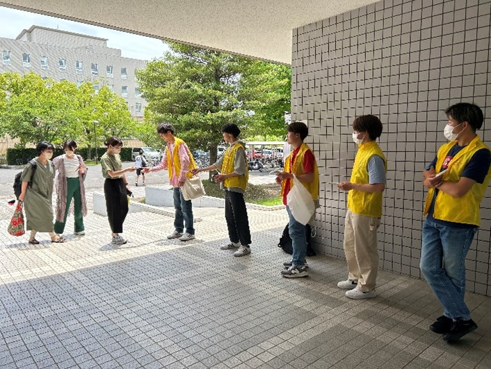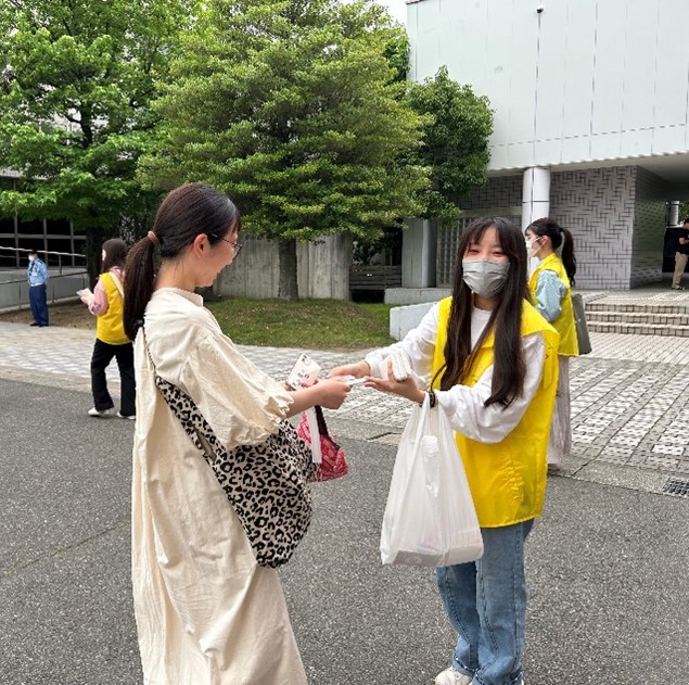 学生一人ひとりが、喫煙、学内美化、駐輪・駐車のマナーについて、意識向上を図れるようにオリジナルティッシュの配布と、ごみ拾いを行いました。