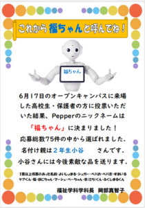福祉学科では、6月に福祉学科の学生・教員を対象に、介護向けpepperの愛称(ニックネーム)を募集し、75もの名前が寄せられました。6月17日のオープンキャンパスで、参加した高校生・保護者の方に名前を見ていただき、気に入ったものに1票投じていただきました。