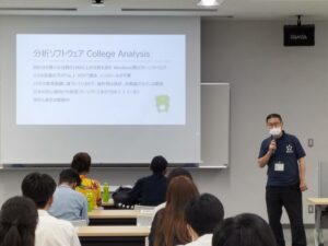 この後のフリープログラムでは、来学者と学生スタッフが歓談し、そして、模擬授業で使用した統計分析ソフト”college analysis”の展示をしました。