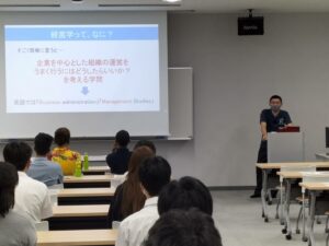 まずは、堀越学科長による学科紹介の中で、経営学科の特長、「経営」と「経済」の違いや卒業後の進路などの説明がありました。