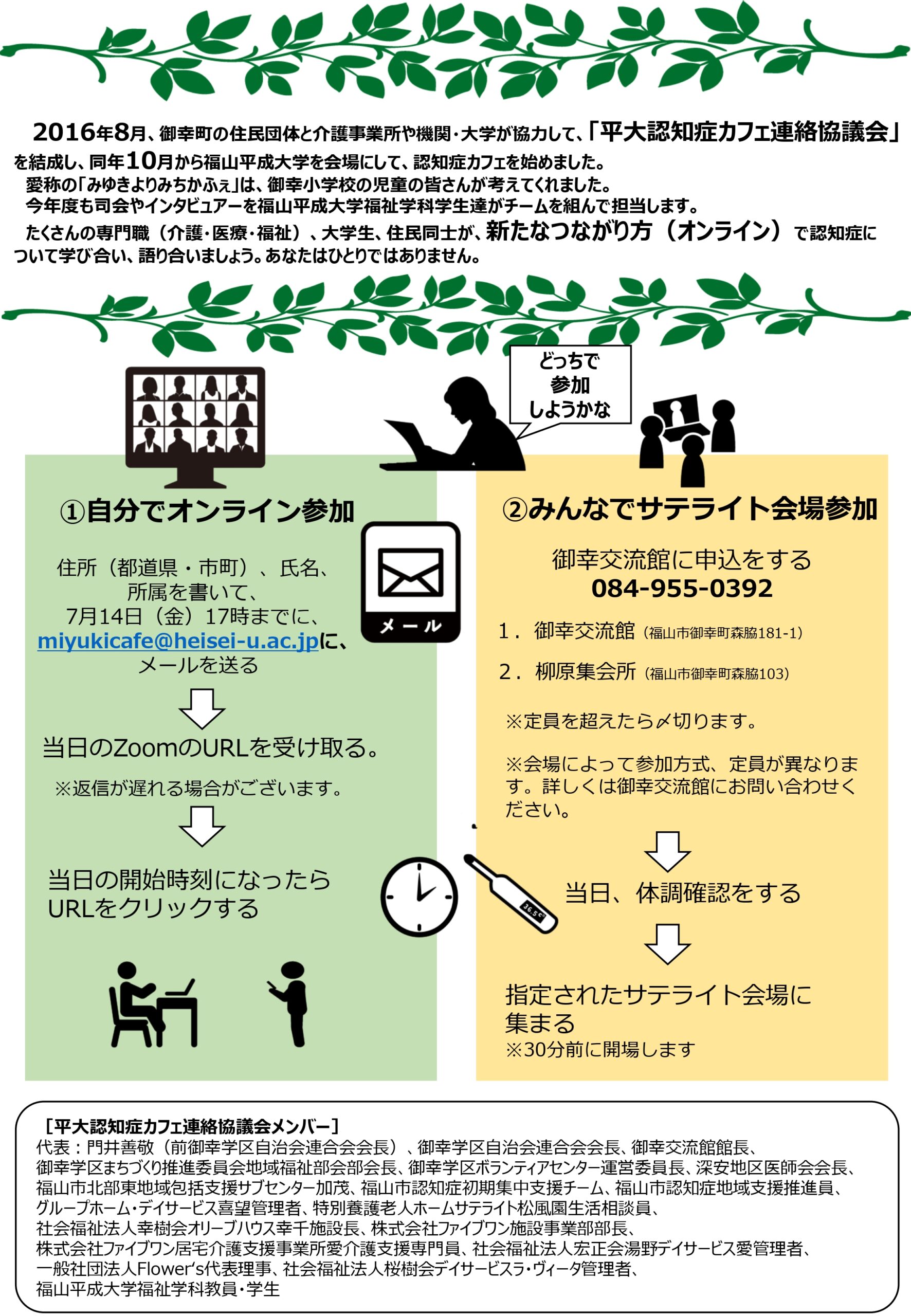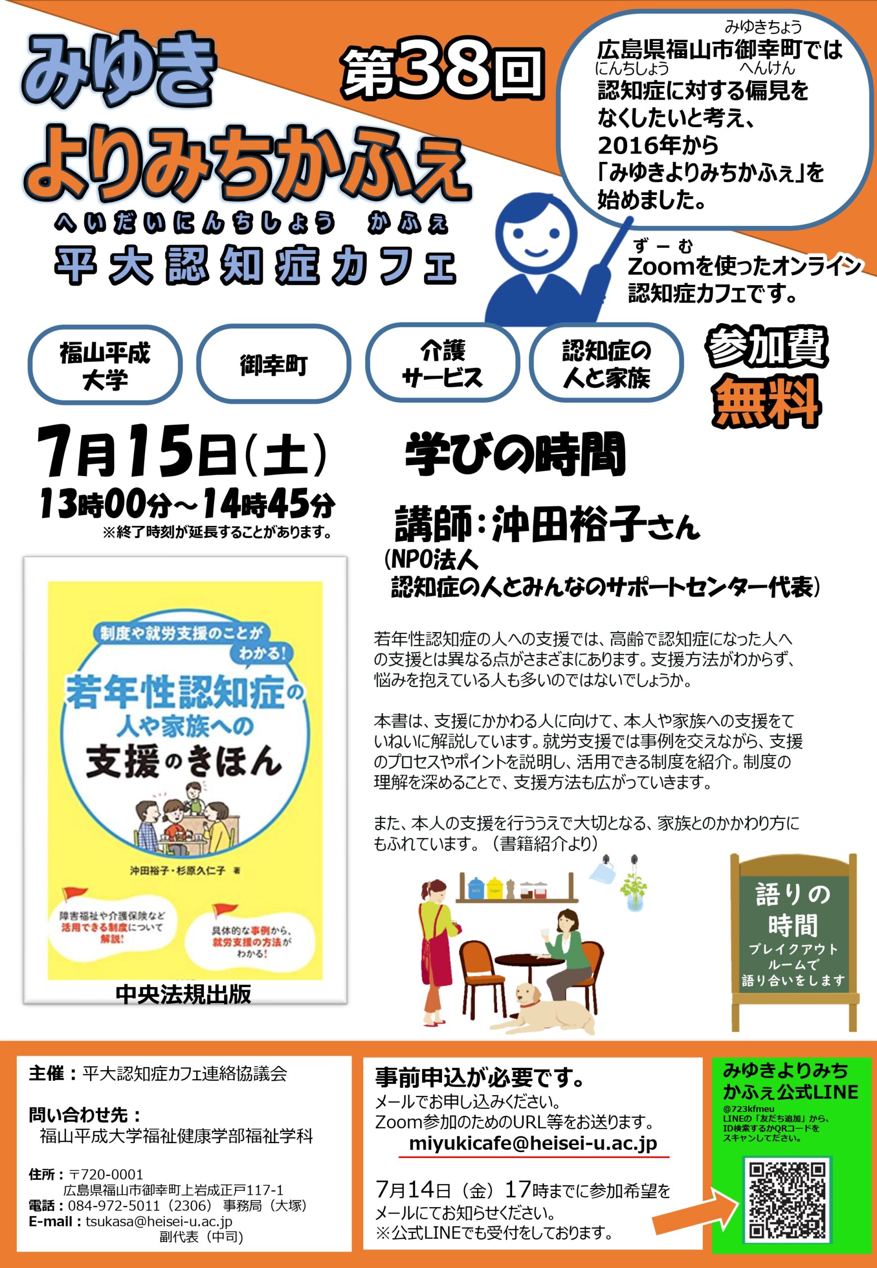 オンラインで開催しています平大認知症カフェ(愛称:みゆきよりみちかふぇ)を、7月15日(土)13:00~14:45に開催します。第38回になります今回は、2009年から若年性認知症の人と家族を支援されている特定非営利活動法人認知症の人とみんなのサポートセンター代表の沖田裕子さんを、学びの時間の講師にお招きしています。