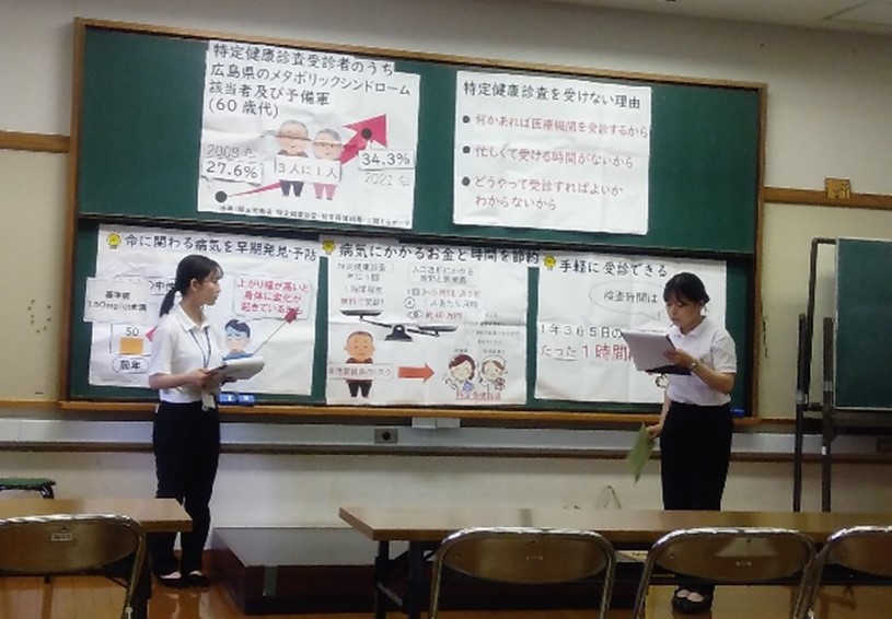 保健師課程の4年生です。福山市保健所で公衆衛生看護学実習を行っています。「特定健康診査に行きませんか?」というテーマで、住民の方に、わかりやすく健康教育を行うことができるよう、一生懸命練習をしています。