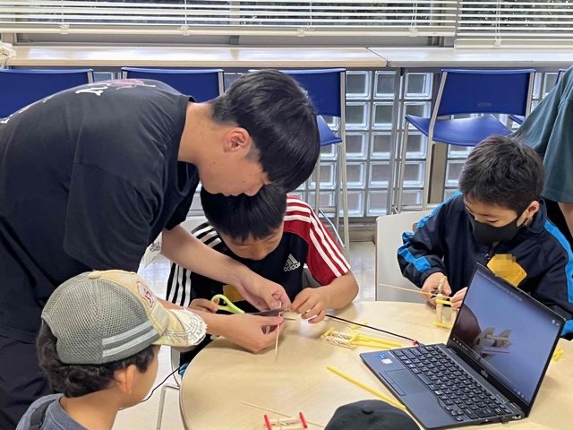 準備の成果もあり、子どもたちは、学生が考えた手作りおもちゃ(ぶんぶんごま、浮沈子、手作りの車、Xジャイロなど)で遊ぶ活動をしっかり楽しんでくれていました。