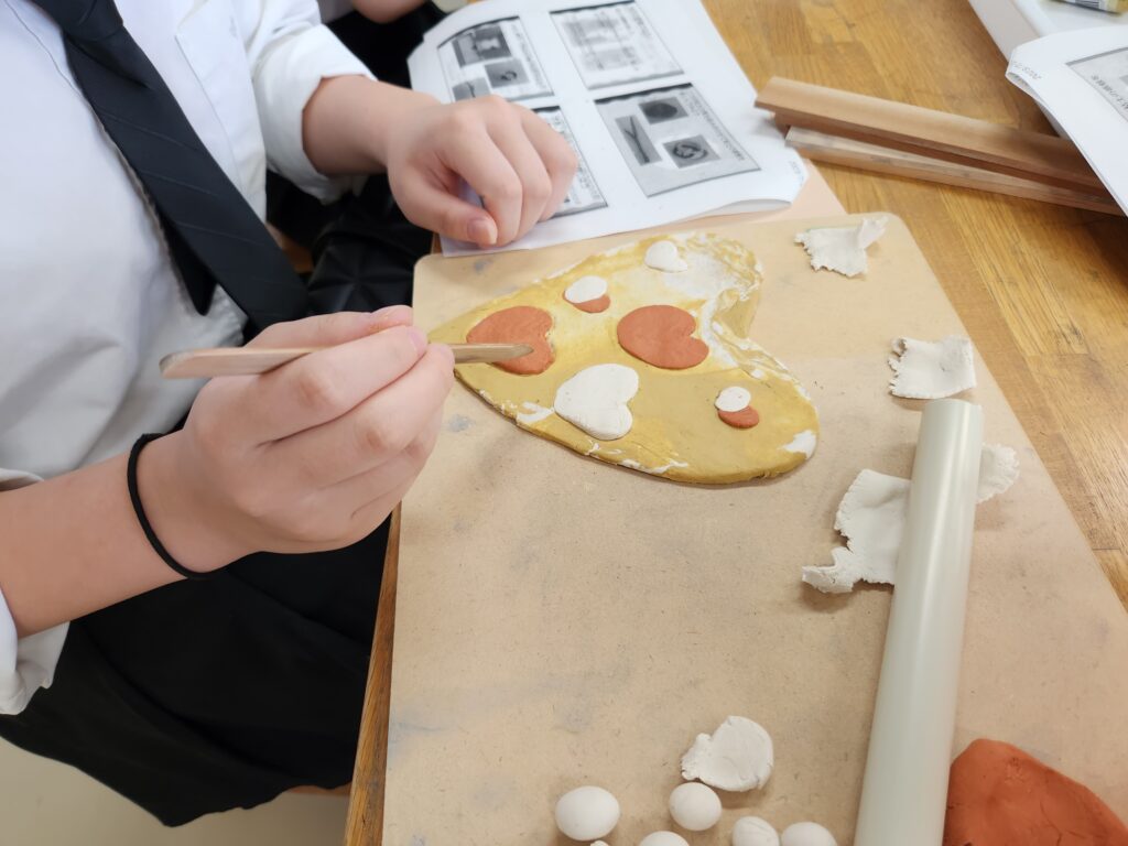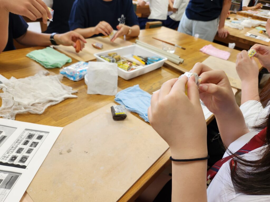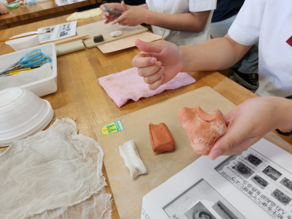 佐伯講師が担当した模擬授業では、「土の粘土による表現」と題して、実際に粘土を成形しながら、器づくりに取り組みました。