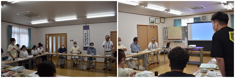 ヒアリング調査では、地区の自主防災組織副会長の川田様、総社市社会福祉協議会の劔持様(本学OB)をはじめ、多くの関係者が出迎えてくださいました。受講生は、災害時の防災組織の対応を再現した動画と、復興に向けたボランティア支援に関する社協の取り組みについての動画を視聴した後、準備した質問をもとにヒアリングを行いました。
