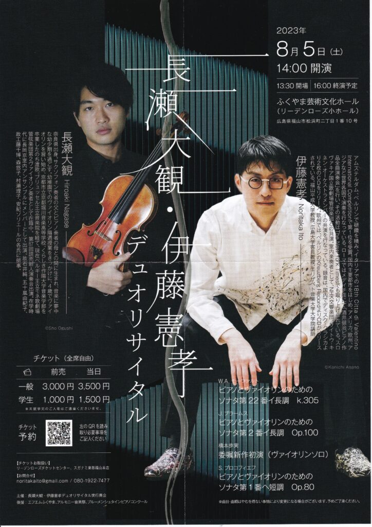 なお、佐藤さんを指導する伊藤教授も5日(土)福山リーデンローズの方でヴァイオリン奏者の長瀬さんとのデュオリサイタルをおこないました。