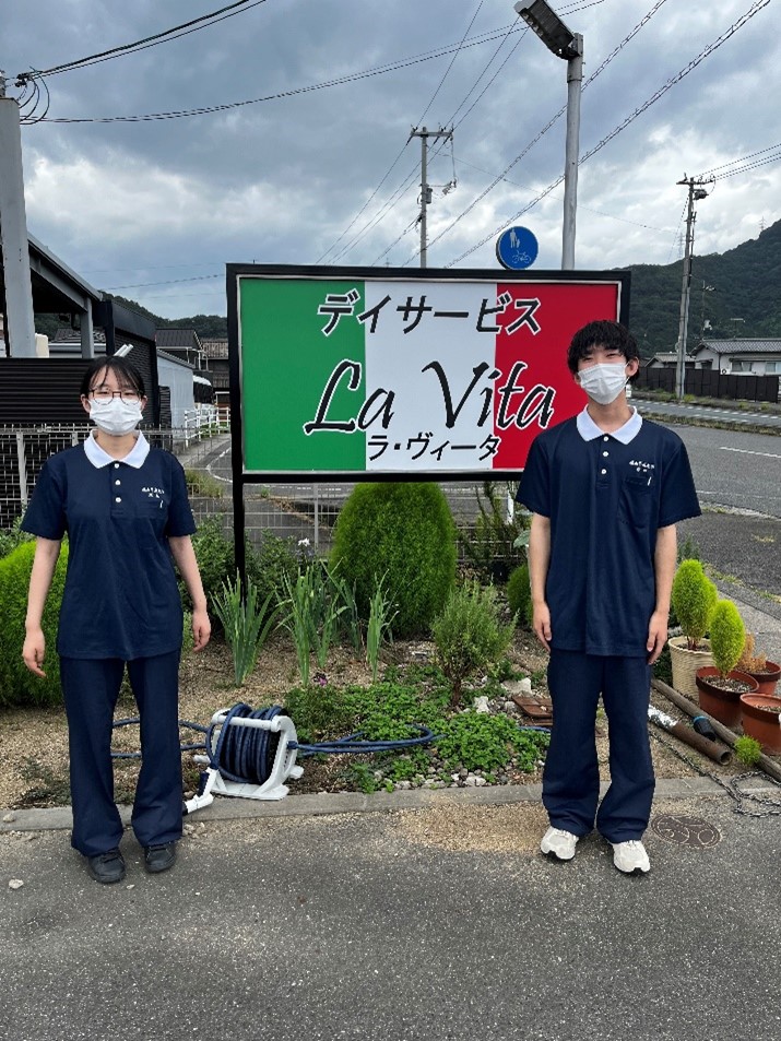 夏休みに入って、介護福祉士の資格取得を目指す3年生は、最後の介護実習である介護実習4(6日間)に出かけています。実習先は、尾道市にある株式会社ゆずの小規模多機能型居宅介護「ゆずっこホームみなり」と、福山市御幸町にある社会福祉法人桜樹会が社会参加型通所介護と名打って運営している「デイサービス ラ・ヴィータ」です。どちらの事業所も広島県東部では注目されている新しい取組みを行っています。