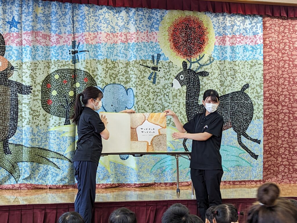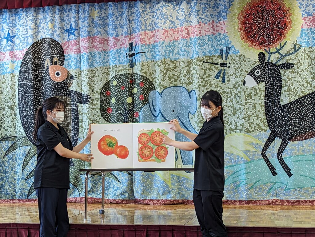 写真は、子どもたちに絵本の読み聞かせをしている姿です。穏やかな読み聞かせで、子どもたちは興味深く絵本の世界に入っていました。また、園長先生からは2人の卒業生の仕事への取組みに、お褒めの言葉を頂戴しています。