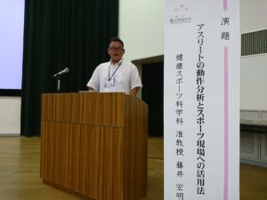 今年度の第1回目の公開講座が9月7日に行われました。講師は本学科の藤井宏明准教授で、テーマは『アスリートの動作分析とスポーツ現場への活用法』でした。
