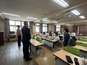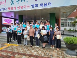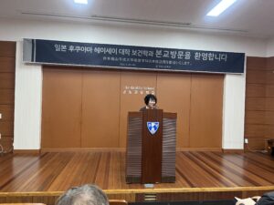 韓国研修(学校視察)2日目は、月背中学校、慶尚高校を見学しました。職員の皆さんのお出迎えや横断幕を張ってのおもてなしで少し恐縮しました。校長先生から壇上でのご挨拶や学校教育方針などについて説明をくださり、本学科の中村教授が韓国での学校視察にあたってのご挨拶をしました。