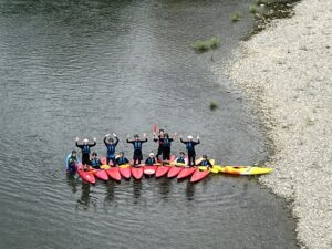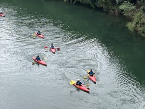 カヌーでは、パドルの使い方やリバーサイン、沈(ちん:転覆、ひっくり返る)の練習を行った後にショートツーリングに出発しました。また途中の岸ではどういったところで水深が深くなっているか流速が速くなっているかなどを教えてもらいました。
