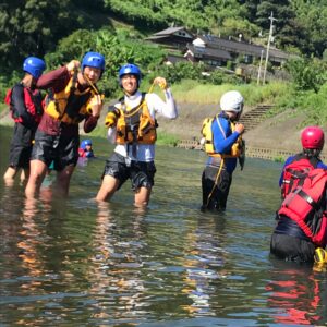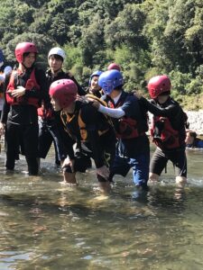 浅瀬横断やロープレスキューでは、川の浅い場所でも一人で歩いて渡ることは困難なこと、複数で隊列を組むことで川の中を歩くことができるということ、スローバッグという水に浮くロープを投げる位置やタイミングなど、実践を通してリバーレスキューについて学びました。