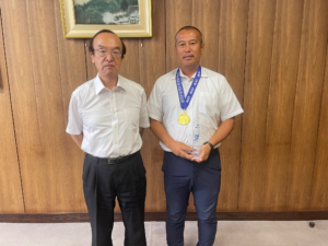 韓国太⽩市において行われた『アジア⼤学サッカートーナメント(2023 Taebaek Asian University Football Tournament)』で、U-20日本大学選抜の監督を務めた本学科の若井研治講師が、冨士学長に試合の結果報告のため、学長室を訪問しました。