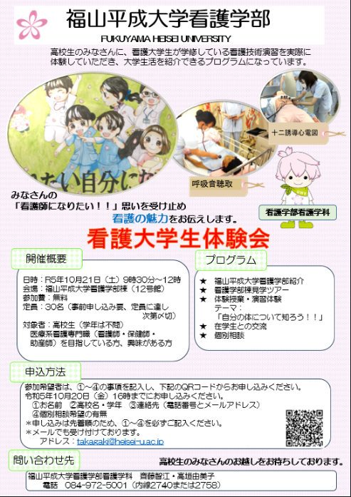 令和5年10月21日(土)に福山平成大学 看護大学生体験会を開催します。