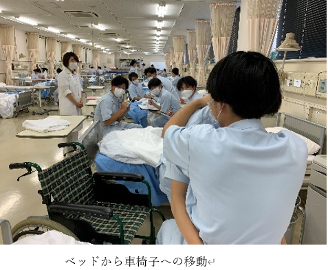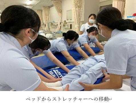 1年生は、初めてのベッドから車いすとストレッチャーの移動・移乗・移送を演習しました。ベッドから車椅子やストレッチ―に移乗し、