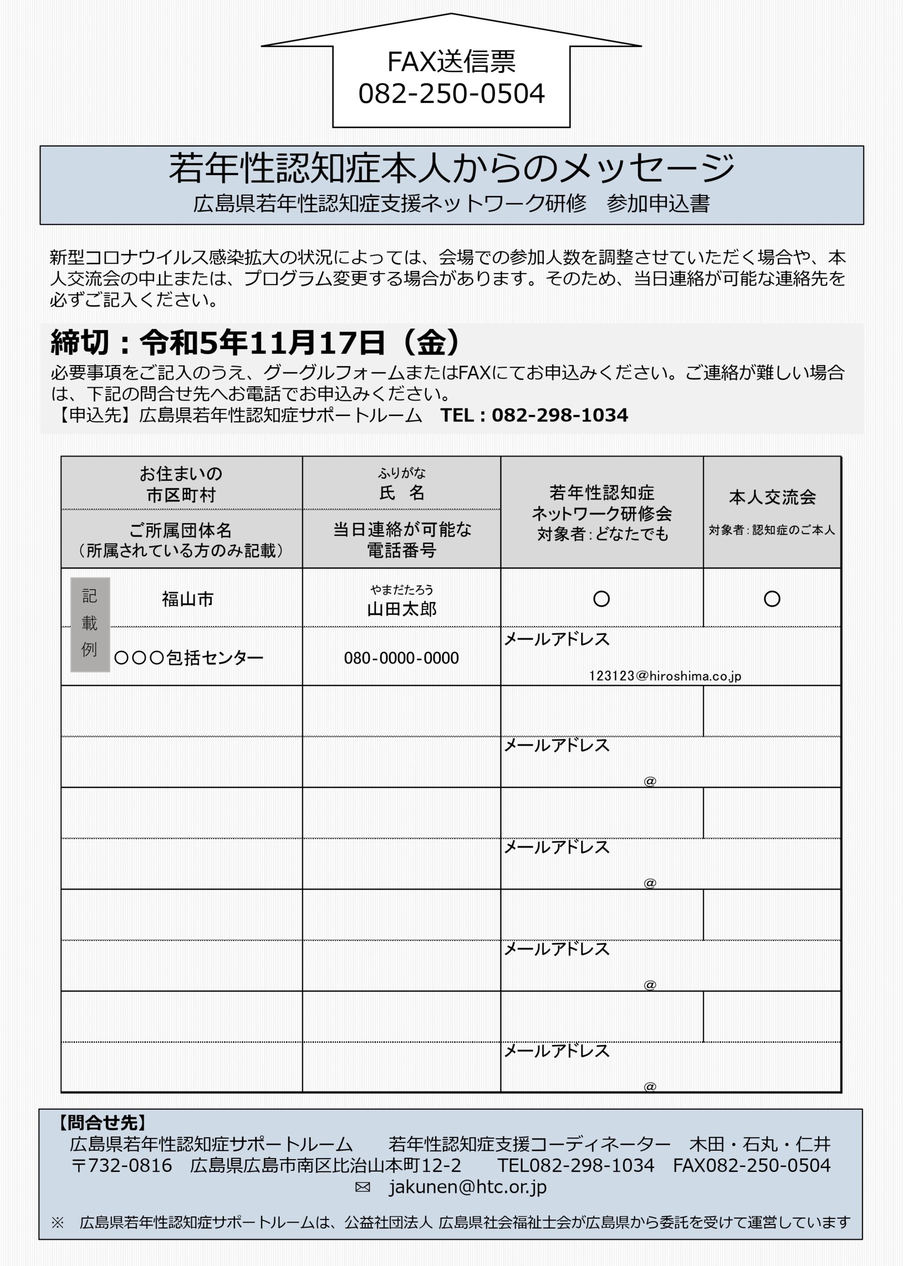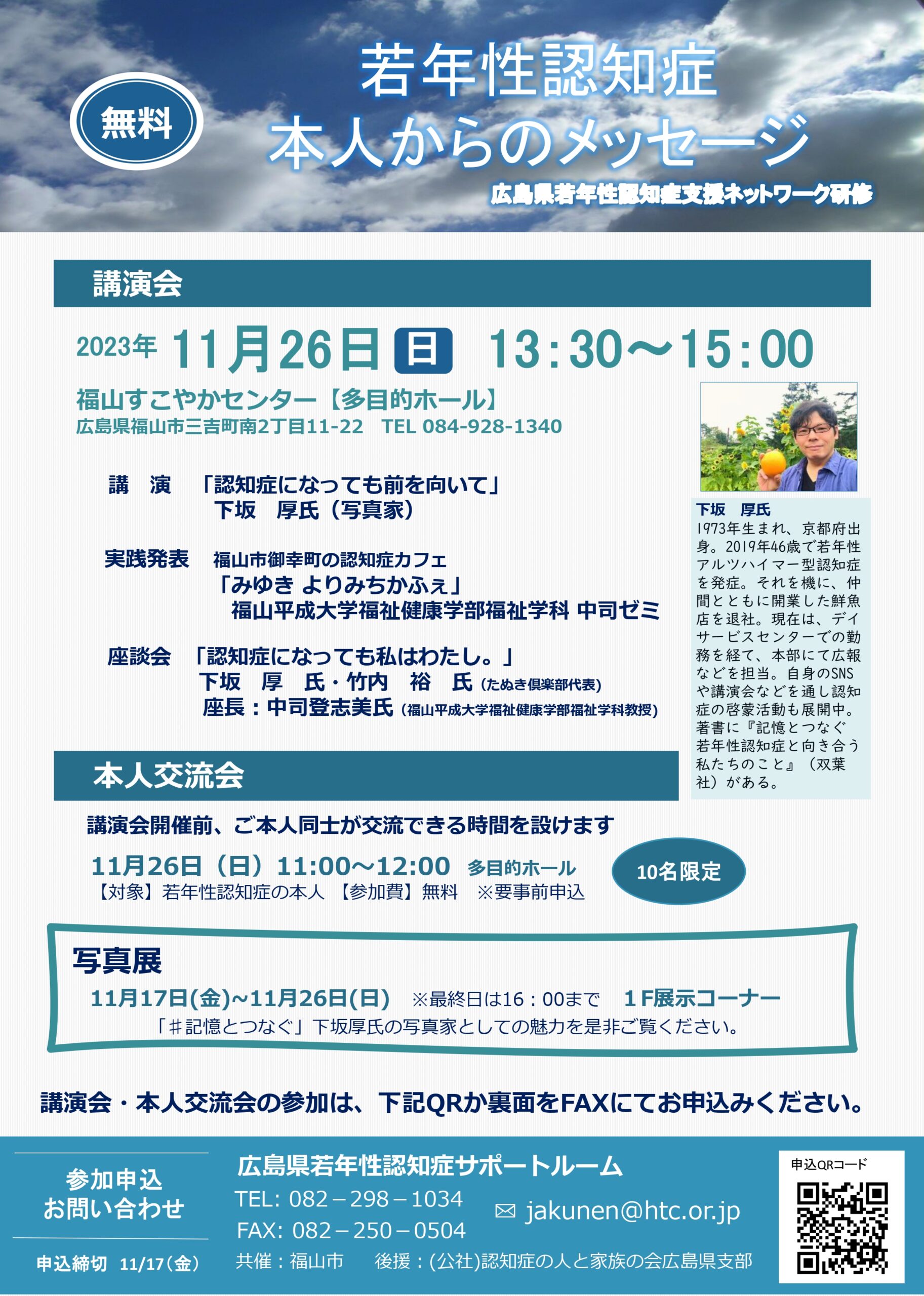 広島県若年性認知症サポートルーム主催の「若年性認知症本人からのメッセージ」というイベントで、福祉学科が2016年から御幸町の住民団体や介護施設・事業所と協働して開催している認知症カフェ「みゆきよりみちかふぇ」の取り組みを、中司ゼミ3年の山本さん、多保さんが発表します。11月26日(日)当日は、午前中に本人交流会も開催されます。若年性認知症と診断されている方、そうかもしれないと不安を感じていらっしゃる方はぜひご参加ください。ご本人さん達が集まって語り合うピアサポートの活動です。午後から講演されます認知症当事者の下坂厚さんもその場に参加されます。