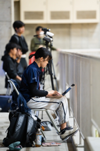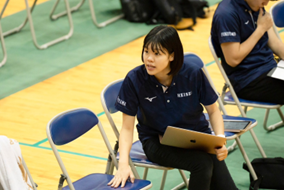 男子バレーボール部でアナリスト(ゲーム分析を専門とする)として活躍している、健康スポーツ科学科4年高辻礼奈さんが、