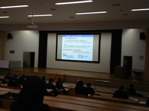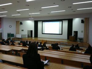 製品の開発から量産までの流れや、各部署での業務内容などを丁寧に説明していただきました。また国内外に関連拠点があり、海外で勤務した際には、考え方の違いなどがあり苦労もあったが、日本の考え方を押し付けるのではなく、地域に合わせる必要があることなど、グローバル社会における働き方やコミュニケーションの大切さについてお話しいただきました。