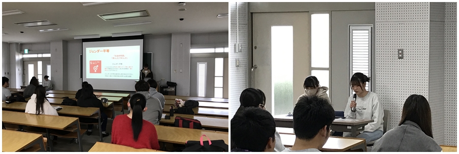 今回の発表では、学生が考えるSDGsの課題にむけて、その背景を調べ、現状を理解したうえで各課題について発表し、自分たちにできることをまとめました。