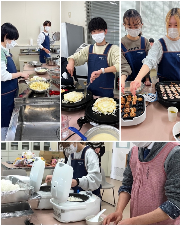 今回は、受講生の3年生が行事食を考えて作りました。この時期施設では、クリスマス会が開かれ、利用者の皆さんとお好み焼きやたこ焼きをつくって食べたりもします。今回は、クリームシチュー、お好み焼き、たこやき、おにぎりをみんなで手分けして作りました。楽しく、美味しい授業でした。
