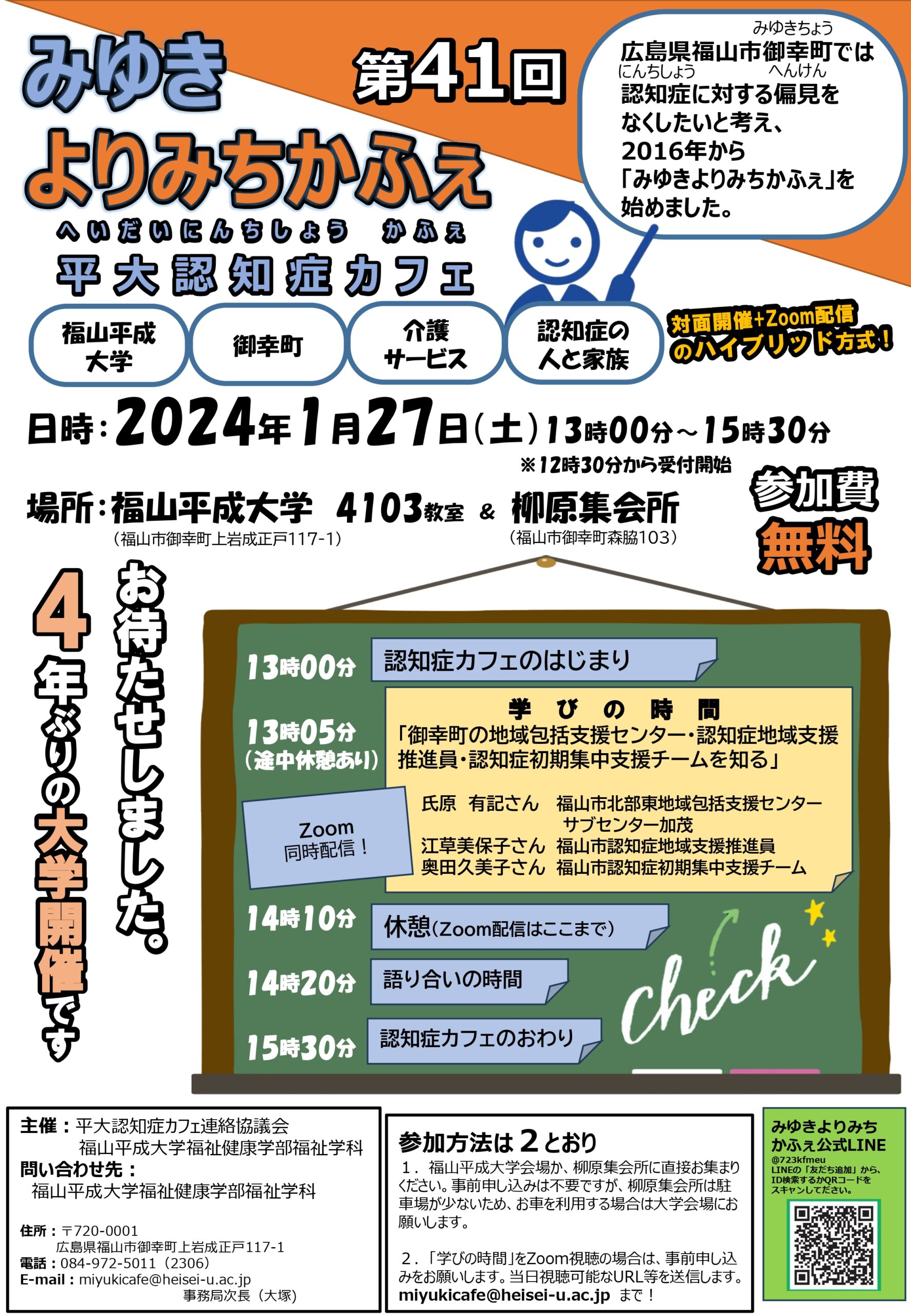 1月27日(土)13:00~、コロナ禍にオンライン化していた「平大認知症カフェ(愛称:みゆきよりみちかふぇ)」を対面開催に戻し、福山平成大学4103教室で開催します。駐車場もありますので、正門からお入りください。当日は係が誘導します。