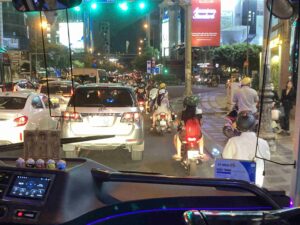 直ぐに、外の様子をスマホで撮影していました。ホーチミン中心部へ移動するバスの中から、バイクの台数の多さ、バイクがほんの僅かな隙間を通り抜けている様をみて、学生たちは改めて現地の雰囲気に驚いていました。