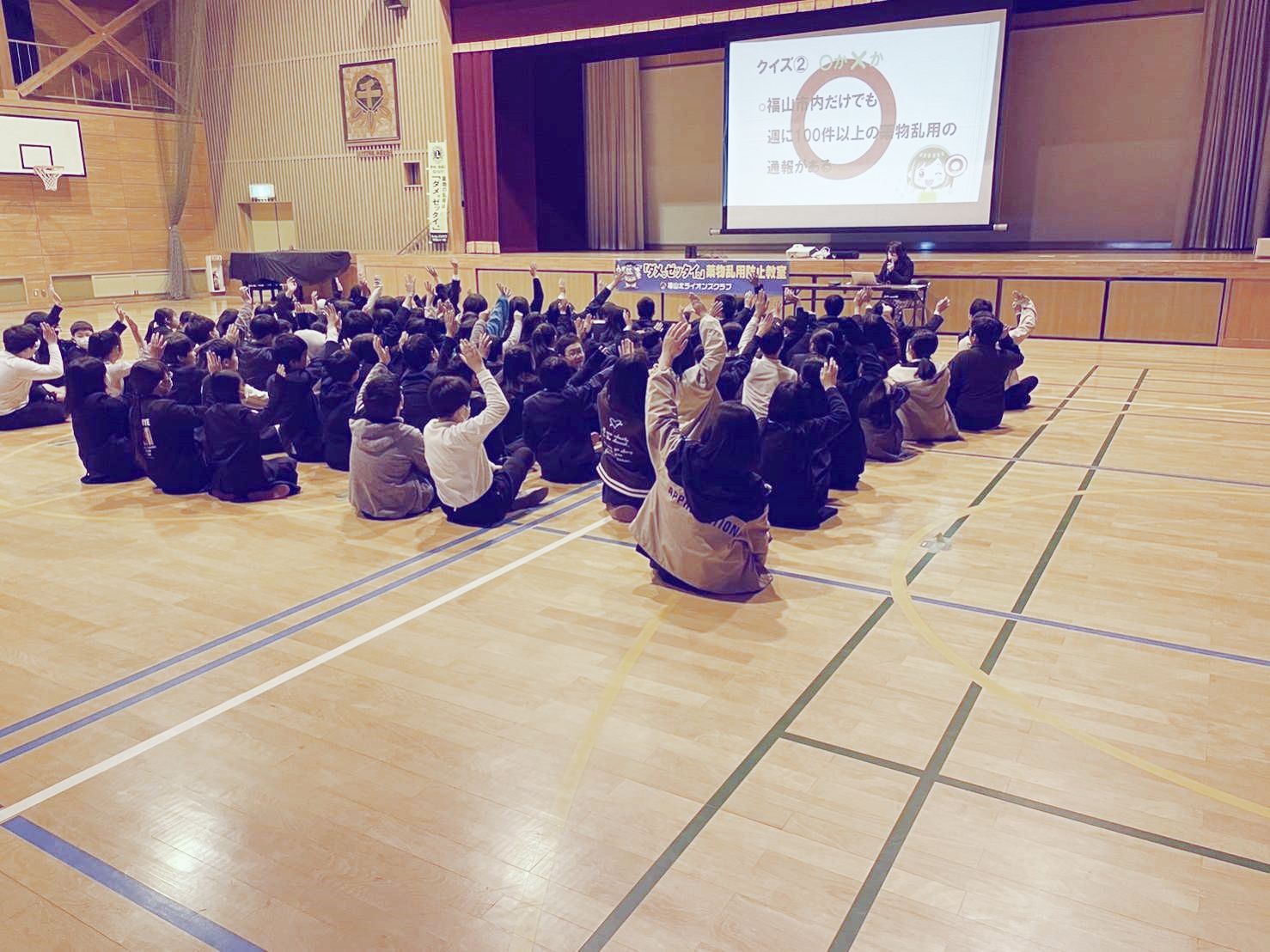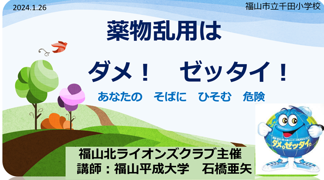 今回、福山北ライオンズクラブのスタッフ4名と共に小学校を訪れ、本学の福祉学科で教鞭をとる石橋先生に講師を務めていただきました。この活動は1月26日(金)に行われ、福山市立千田小学校の6年生107名が対象でした。