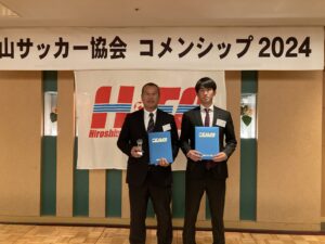 (健スポ)福山サッカー協会コメンシップ2024で若井研治監督と3年 勇次大希君が表彰されました