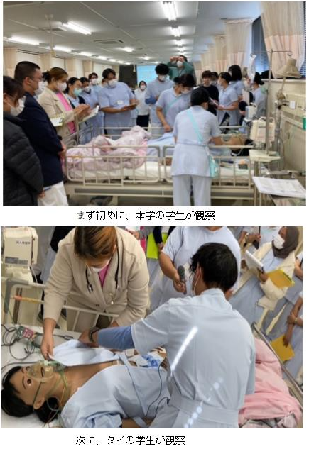 事例を用いて術後患者の観察を本学の学生、タイの学生と交互にシミュレーションを行い、両国の違いや共通点などについて、活発な意見交換を行いました。
