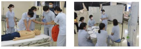 午後からは、リーダーを中心とした病院での急変時を想定したシミュレーションを用い、その後グループワークで振り返りを行いながら蘇生に必要な役割分担や手順を学びました。