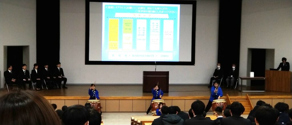 5学科全員の表明が終わり、最後はみんなで鬨の声、そして御幸太鼓で締めました。