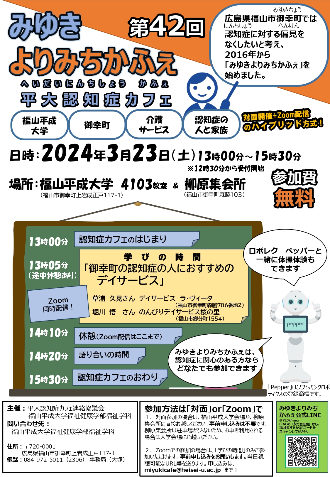 3月23日(土)13:00~、コロナ禍にオンライン化していた「平大認知症カフェ(愛称:みゆきよりみちかふぇ)」を対面開催に戻し、福山平成大学4103教室で開催します。駐車場もありますので、正門からお入りください。当日は係が誘導します。
