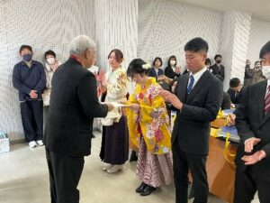 石橋勇学科長から祝辞が行なわれた後、一人ずつ前に出て証書が授与されました。