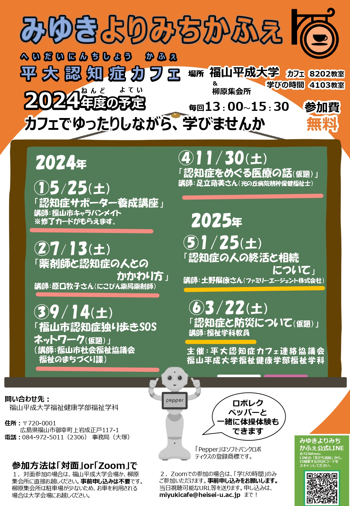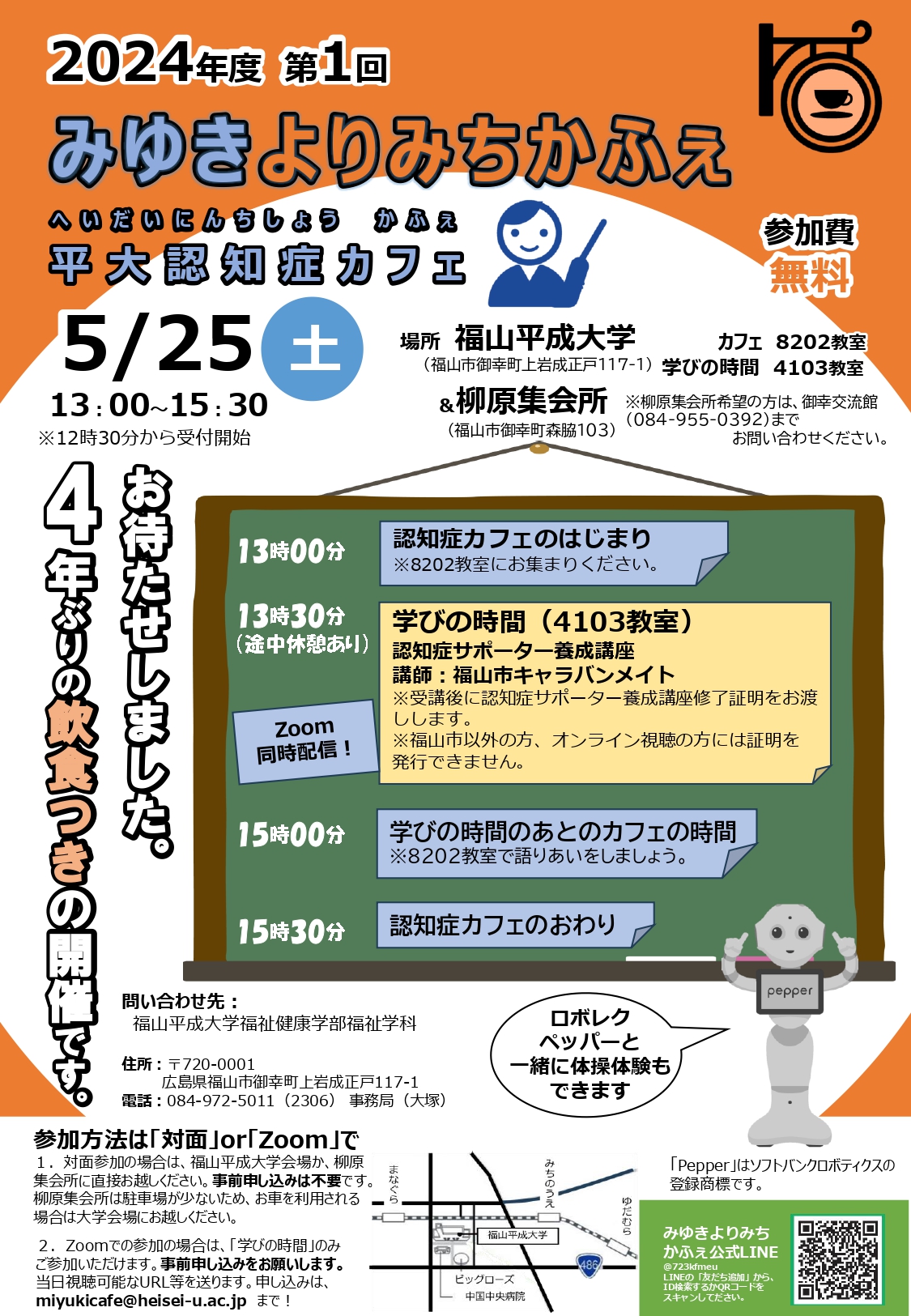 5月25日(土)13:00~、「平大認知症カフェ(愛称:みゆきよりみちかふぇ)」(参加費無料)を、福山平成大学4103教室で開催します。今回のカフェの内容は、認知症サポーター養成講座 講師:福山市キャラバンメイトです。
