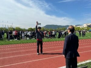 開会式では、冨士学長の挨拶のあと、健康スポーツ科学科 4年 信本 達哉さんが選手宣誓を行いました。